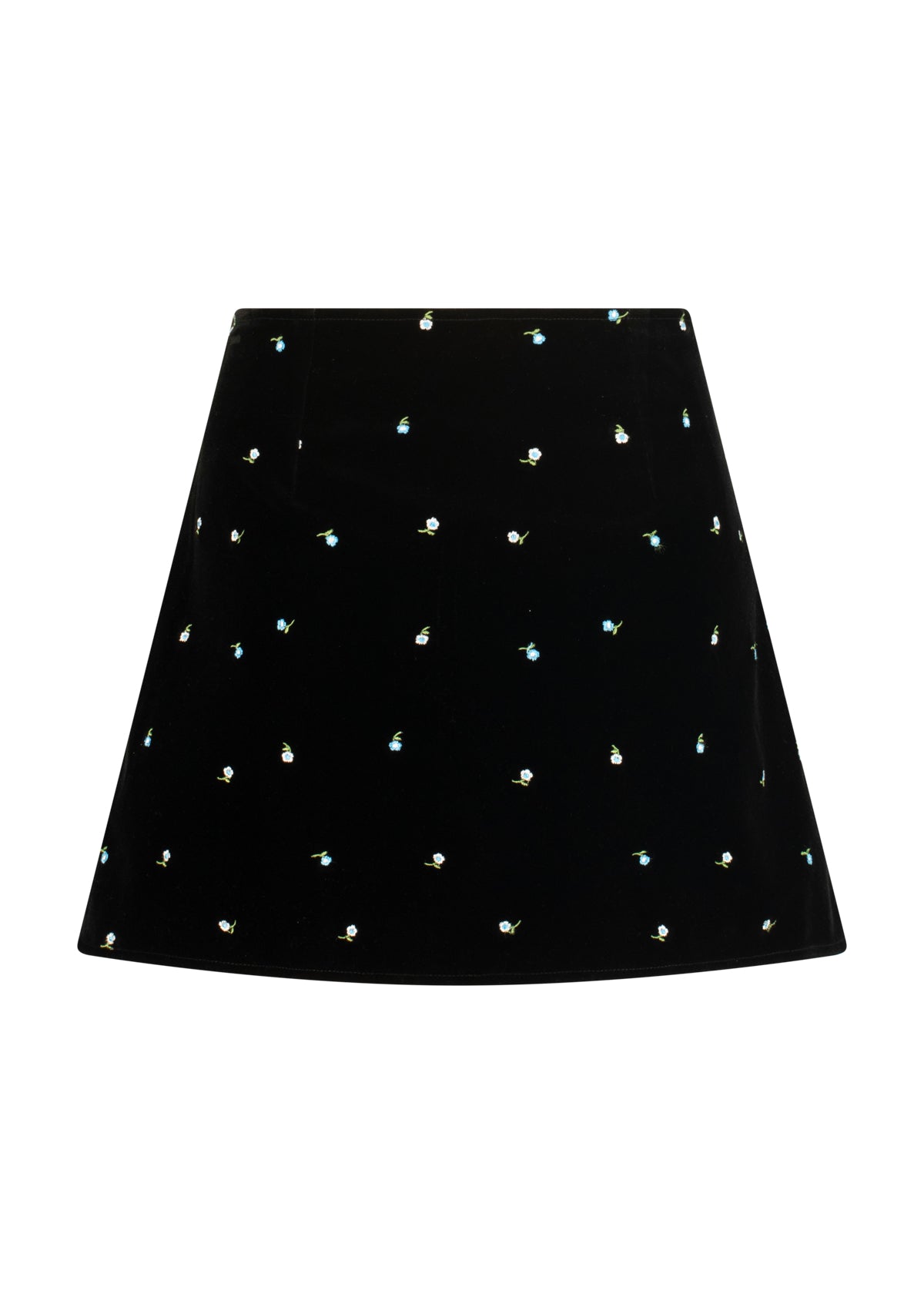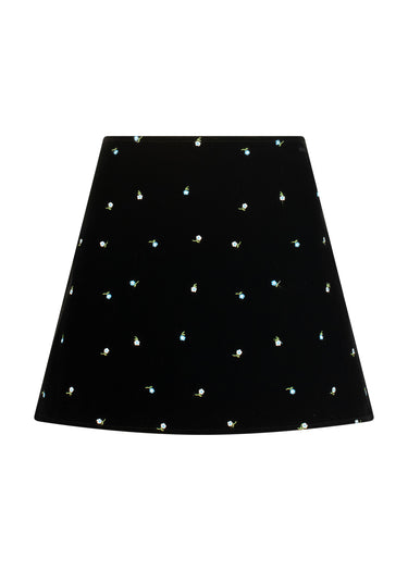 Our Jackie set returns in a new season’s finish, soft black velvet embroidered with blue florals. The cropped jacket features a rounded neckline and puffed sleeves, paired with a clean-cut mini skirt for a silhouette that’s both playful and composed. A timeless shape, reimagined in richer texture and mood for FW25.